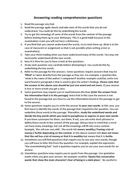 Alright, let’s talk about some killer strategies to help you pinpoint the answers quickly and efficiently. When you’re faced with a comprehension question, the first thing you want to do is read the question carefully . Seriously, guys, don’t just skim it. Break it down. What is it actually asking? Identify the key terms or concepts in the question. For example, if the question is, “What was the primary cause of the character’s decision?”, your keywords are “primary cause” and “character’s decision.” Once you’ve got those keywords locked in, it’s time to scan the text . Don’t read it word-for-word again unless you have to. Instead, look for those keywords you identified. They’ll often lead you directly to the relevant sentence or paragraph. Think of it like a treasure hunt! Sometimes the keywords might not be exact matches, so be on the lookout for synonyms or related phrases. For instance, if the question uses “reason,” the text might use “motive” or “justification.” Another super helpful technique is to read the surrounding sentences . Once you find a sentence that seems to contain the answer, read the sentences before and after it. This helps you understand the context and ensures you’re not misinterpreting the information. It also helps you confirm that this is indeed the primary cause, not just a cause. Finally, underline or highlight the part of the text that contains the answer. This is a great visual cue for yourself and helps you ensure your answer is directly from the text. By employing these strategies, you’ll be able to answer comprehension questions more accurately and much faster. It’s all about being strategic and not getting lost in the details. You’ve got this!