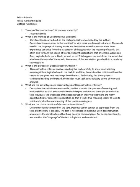 5. Deconstruct the Text: Once you’ve identified the binary oppositions, hierarchies, aporias, and margins, you can begin to deconstruct the text. This involves challenging the dominant interpretations and exploring alternative readings. Question the assumptions and biases that underlie the text’s meaning. Show how the text undermines its own claims and opens up multiple possibilities for interpretation.