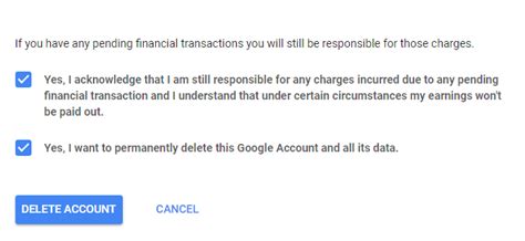 5. Acknowledge the terms: Scroll down to the bottom of the page and check the two boxes to acknowledge that you understand you are responsible for any charges due to pending financial transactions and that you still want to delete your account. These check boxes are there to ensure that you are fully aware of the implications of deleting your account.