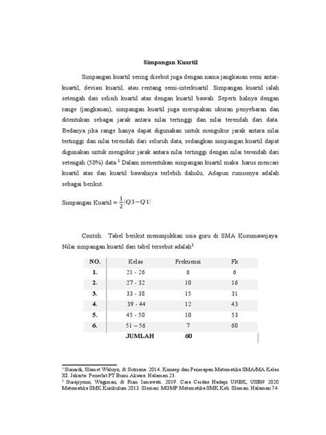 Voila! Jadi, simpangan kuartil dari data 2 4 6 8 10 adalah 3 . Gampang kan? Kuncinya ada di ngurutin data dan nentuin mediannya dengan bener. Kalau dua langkah itu udah dikuasai, sisanya tinggal masukin rumus aja.