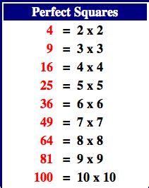 • Know your perfect squares: Memorizing the first few perfect squares (1, 4, 9, 16, 25, etc.) will speed up the factoring process.