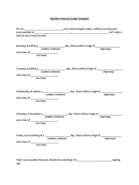 Let’s break down each section to ensure maximum impact. In the opening, grab your audience’s attention with a catchy phrase or a relevant weather-related anecdote. This sets the tone for the entire forecast and encourages viewers or listeners to stay tuned. When describing current conditions, use vivid and descriptive language to paint a picture of the weather outside. For example, instead of simply saying “the temperature is 30 degrees Celsius,” you could say “the sun is beating down, and the temperature is a scorching 30 degrees Celsius.” This adds a layer of sensory detail that makes the forecast more engaging. In the detailed forecast section, be specific and precise. Use numbers and percentages to convey information accurately. For example, instead of saying “there is a chance of rain,” say “there is a 60% chance of rain this afternoon.” This gives your audience a clearer understanding of the likelihood of precipitation. When discussing the extended forecast, avoid making overly specific predictions. Weather patterns can change rapidly, so it’s best to provide a general overview rather than a detailed forecast. In the warnings and advisories section, be direct and urgent. Use strong language to convey the severity of the situation. For example, instead of saying “there is a typhoon approaching,” say “a powerful typhoon is headed our way, and we urge everyone to take precautions immediately.” Finally, end your forecast on a positive note. Offer words of encouragement and remind your audience to stay safe and prepared.