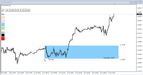 2. Draw the Box: Select the rectangle shape tool from the MT4 toolbar. Click and drag to draw a rectangle that encompasses the price range. The top of the box should align with the resistance level, and the bottom should align with the support level. Make sure the box is wide enough to capture the price action within the range.