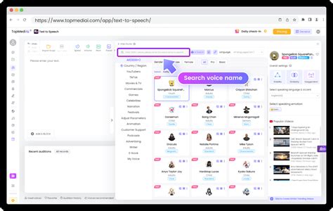 • Voices: Browse the library of available AI voices and choose the ones that best suit your needs. You can filter voices by gender, language, accent, and other parameters.